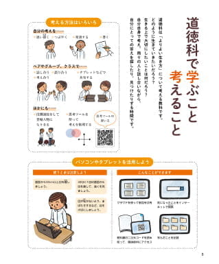 教科書の巻頭「道徳科で学ぶこと 考えること」で、インターネットやタブレット端末などを活用し、学びの幅をさらに広げる方法を紹介しています。